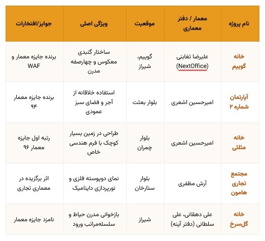 شیراز در یک دهه اخیر، بیشترین تعداد برندگان “جایزه معمار” (معتبرترین جایزه معماری ایران) را به خود اختصاص داده است. این موضوع نشان‌دهنده وجود یک “مکتب شیراز جدید” است که در آن کارفرمایان نیز به اندازه معماران، دغدغه کیفیت و زیبایی‌شناسی مدرن را دارند.